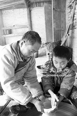 因有一手祖传的拉坯绝活,一次成型可以拉出多达13节而且中空的葫芦,现年76岁的王炎生,于2008年被景德镇市市政府评定为手工制瓷技艺国家级非物质文化遗产的传承人,每月享受着政府给予的400元津贴。由于5个子女当中,没有一个对陶瓷传统手工技艺感兴趣,日前,担心祖传的拉坯手艺到自己这一代就失传的王炎生,在几经思量后,将对陶瓷技艺颇感兴趣的外孙梁渊晟正式列为自己的传承人,希望外孙能将代代相传下来的拉坯手艺发扬光大。