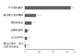 而在“如何对待网络论坛上出现的恶意、不健康信息”的调查中,65%的大学生选择了“不予理睬”;16.1%的大学生选择“建议版主及时删除”;9.9%的大学生表示会“跟帖批驳”;3.2%的大学生表示会“主动举报”。可见,虽然大学生有一定的网络防范意识、安全意识和道德判断能力,但其自觉、主动抵制不良信息的意识还需进一步加强。