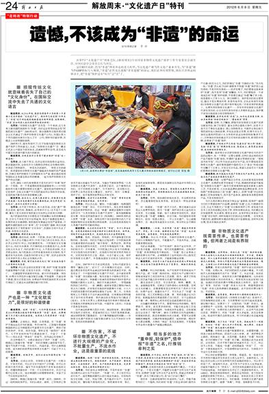 遗憾,不该成为“非遗”的命运 解放周末·“文化遗产日”特刊 解放日报 2012年6月8日 作者:曹静 5月19日,在深圳文博会“非遗馆”,来自海南的民间手工艺人展示传统纺染织绣技艺。新华社记者 梁旭 摄 采写/本报记者 曹静 在第7个“文化遗产日”到来之际,《解放周末》专访国家非物质文化遗产保护工作专家委员会副主任、中国民俗学会荣誉会长乌丙安。这位83岁高龄、仍为“非遗”四处奔走的老人疾呼:当文化遗产被当作文化产业来开发,当“非遗”被当作GDP指标写入规划,“非遗”必然无法逃脱“非常遗憾”的命运。我们必须时刻警惕,别在经济利益的驱动下,把“非遗”保护这本“好经”念“歪”了。 损毁传统文化就意味着丧失了自己的“文化身份”,在国际交流中失去了共通的文化语言 解放周末:从2006年起,国务院将每年六月的第二个星期六定为中国的 “文化遗产日”,到今年已经是第7个年头了。“非遗”这个词也越来越被普通百姓所熟悉。追根溯源,“非遗”是如何进入我们的视野和意识的呢? 乌丙安:“非物质文化遗产”其实是一个外来词,近几年来又被我国民间简称为“非遗”。我们过去常用的说法是“民族民间文化遗产”。2003年10月,联合国教科文组织第32届会议正式通过了《保护非物质文化遗产公约》,我国以第六个签约国的快速反应加入了这一公约。那时我们就觉得,在提法上应该和国际接轨。 2005年3月,国务院颁布了《关于加强我国非物质文化遗产保护工作的意见》,从此,“非物质文化遗产”这一概念正式进入中国官方语言体系,迅速被学界所启用,甚至成为中国文化语境中最为流行的新词。 解放周末:当时是在什么背景下提出保护“非遗”这一理念的? 乌丙安:进入新千年后,经济全球化的趋势日益突出。联合国意识到,全球化在大力助推经济和社会发展的同时,也造成了两种破坏,一种是生态的破坏,一种是文化的破坏。很多国家的非物质文化遗产面临消失和破坏的严重威胁,在缺乏保护的情况下这种威胁尤为严重。联合国进而倡导国际社会本着互助合作的精神,一起为保护非物质文化遗产作出贡献。 当然,国际上的约束和要求只是我们进行“非遗”保护的一个原因。另一个更重要的原因是国情使然——中华民族的伟大复兴需要非物质文化遗产,国家机体内部呼唤对它的保护。这些文化遗产不仅是民族自我认知的历史依据,也是民族不断走向未来的精神之源。 解放周末:在这点上,也有人提出疑义:非物质文化遗产是我国一定历史时期中文化发展的见证,但它毕竟是“文化化石”,在今天还有什么价值? 乌丙安:这不是个别观点。有人甚至说,这些“遗产”都是古老的、腐朽的、愚昧的,还用来干什么?这不是个小问题,事实上是关涉到对本民族文化如何认识的重大问题。 每个民族的传统文化都是这个民族赖以生存的精神滋养,它在几千年的历史中培育起来,和这个族群息息相关。如果传统文化被损毁,本民族的发展就会受到严重损害,只能把其他民族的文化“拿来”,走“文化殖民”道路。而这也就意味着丧失了本民族的“文化身份”,在国际交流中失去了共通、共享的文化语言。 解放周末:那将是极大的悲哀。 乌丙安:确实如此。如果一个民族,连自己都无法认同自己,别人怎么可能认同你?你丢了自己的文化身份,别人还怎么识别你?所以,我们需要思考:一个民族的文化支撑是什么;我们与生俱来、代代相传的文化根基是什么;如果这些文化失去了,我们还剩下什么。人不是经济动物,无论怎样全球化,每个民族身上仍然有着深深的文化烙印,是不能丢也无法丢的。这就是我们的文化之“根”。经济全球化和文化多样性是人类社会发展的必然。 解放周末:寻找、固守我们的文化之“根”应该成为每个人应有的文化态度。 乌丙安:所以在全球化的背景下看,保护“非遗”的重要性就显得格外凸显,它甚至关系到一个民族、一个国家的兴亡。一位德国哲学家就曾对我说,新兴经济体就像一列快车,如果仅仅用经济头脑支配它去跑,不知道哪一天就会摔下悬崖,因为它是盲目的。如果始终用本民族的优秀文化来引领自己,它就会永远把握住前行的方向。 非物质文化遗产也是一种 “文化软实力”,是很好的和谐使者 解放周末:说到 “非遗”,人们印象深刻的一件事便是2005年韩国江陵端午祭申报世界 “非遗”成功。此事刺激了不少国人的民族情感,也促使人们思考保护 “非遗”的重要性。 乌丙安:必须承认,韩国、日本等国,在 “非遗”保护方面远远走在我们前面。早在1967年,江陵端午祭就被韩国政府认定为韩国第13号重要无形文化遗产,得到了很好的保护、传承。而在我国,那时正是 “破四旧”的年代,几乎所有的传统节日都被砍掉了,只留了一个春节——而且还是 “革命化”的春节,其内涵已经变味了。 在这种情况下,当联合国启动了保护 “非遗”公约,韩国以江陵端午祭 “申遗”,我们在情感上就招架不住了:端午节发源于中国,历史悠久,内涵丰富,凭什么被韩国抢报,成为他们的世界级非物质文化遗产?引起了不少人的激愤。 解放周末:时隔多年,我们应该如何看待这场 “非遗”之争? 乌丙安:应该认识到,非物质文化遗产的一大特点是,它是无形的,可以在文化空间中广泛传播,也可以在时间中世代传承。端午节在我国是两千多年来创造的文化,