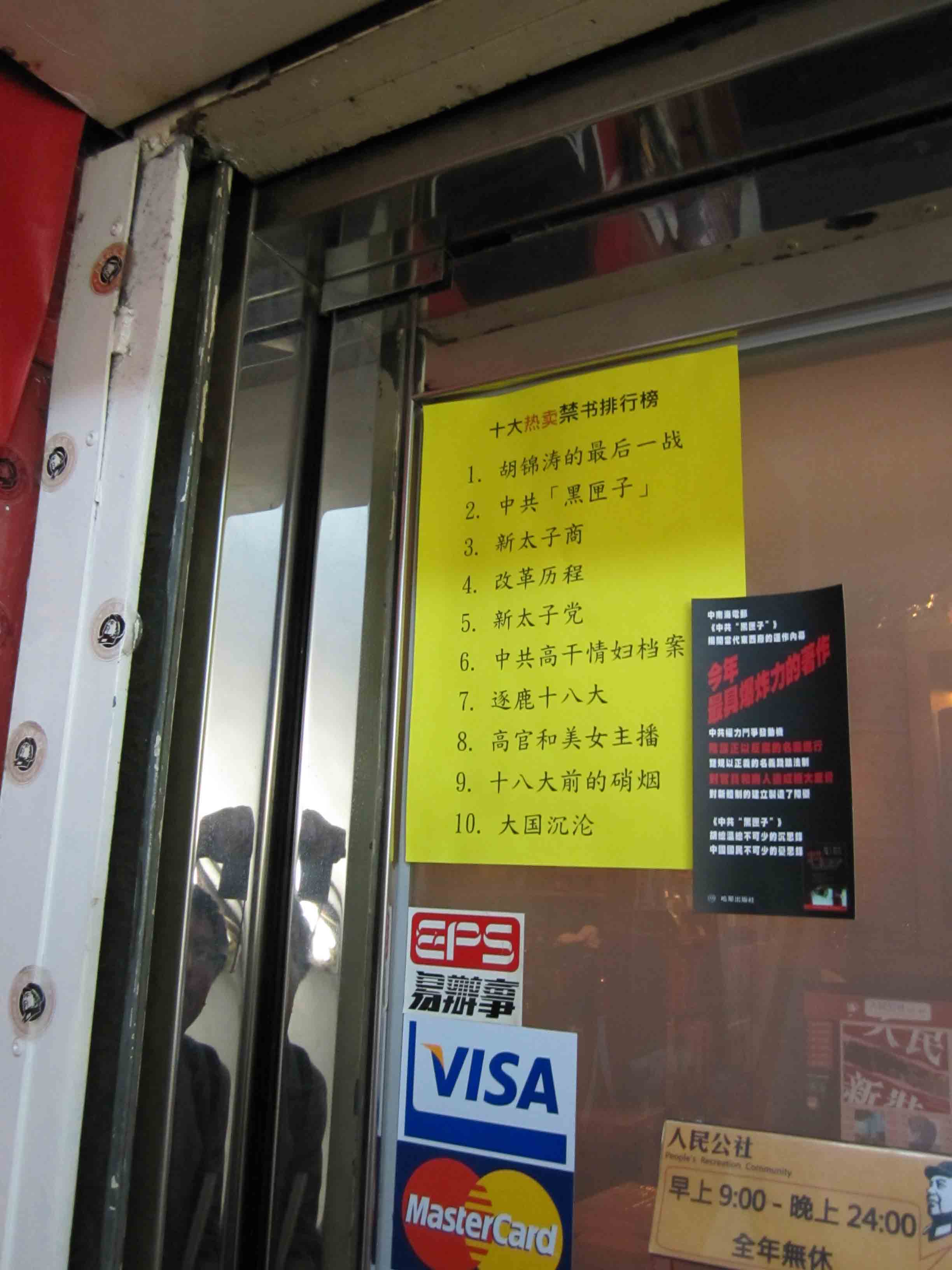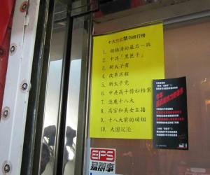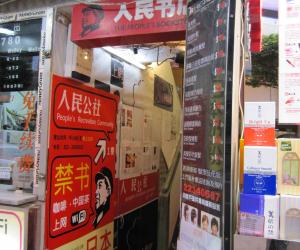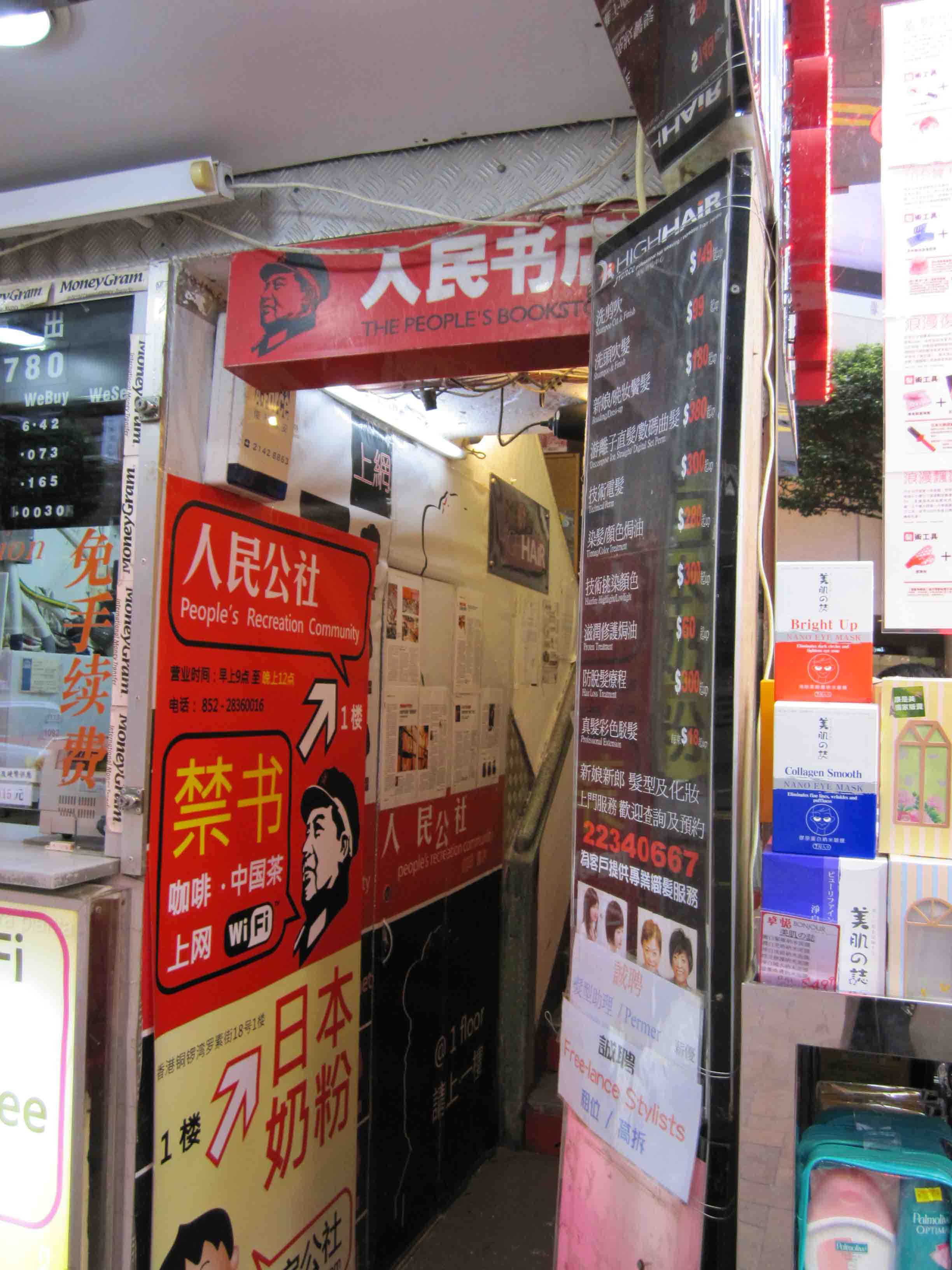 临行前,带上一本北京贝贝特出版的《搭地铁 游香港》,想当作游览香港的拐棍。书中介绍到铜锣湾附近的两家书店:阿麦书房和人民公社。按图索骥,找到书中所说的位于铜锣湾恩平道的阿麦书屋,书屋已经不存在,原址正在装修,大概是要改作美容美发室,拨打书上留的电话也已经打不通。离此不远,找到了位于罗素街18号的人民公社(人民书店)。在众多化妆品、人民币兑换的广告牌中,以毛主席头像为标示的“人民公社”书店店招还是有些另类,楼道口以禁书为号召的广告招贴也颇为显眼。书店位于二层,店面不大,约有四五十平米,但内部装饰风格给人印象深刻。书店分为两部分,一般是展示图书的书架,一半是茶座,提供各类茶品,还有本书店自己的小纪念品。书店装饰的细小处也显示出店主人的用心,即使在卫生间里,还放有一本《东亚的厕所》,顺手拿起来翻看,此书竟是我熟识的韩国人类学家金光彦所著,江苏译林出版社出版。细细翻看了书架上的图书,其中以大陆版简体字版为主。离开人民公社时到有些不好意思:翻看了许久,一本书也没买。