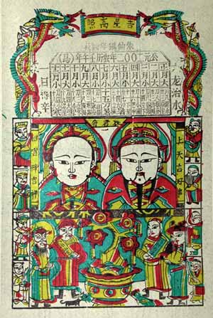 灶王爷可是年节敬奉的神明中最露脸的一尊,祭灶的风俗很早就有了,是先民对火、灶的感激、崇敬之情的表达。在传说中,黄帝、炎帝、祝融都是灶神。后世流行的灶神姓张名单字子郭,长得象个美女。他有一个叫“卿忌”的夫人,有六个都叫“察洽”的女儿,还有好几位兵将。他除职掌灶火之外,还要考察人间的所作所为,上告天帝。人们还用酒糟、饴糖、粘糕等“贿赂”灶神,同时还喃喃祷祝,求他上天讲好话。这个风俗一直传到了今天,不过时间是在腊月二十四,祭食也简化成了“灶糖灶饼”,可是你要是留心的话,一定还会听到奶奶、妈妈在叮嘱灶王:上天说好话,不好的可别说……