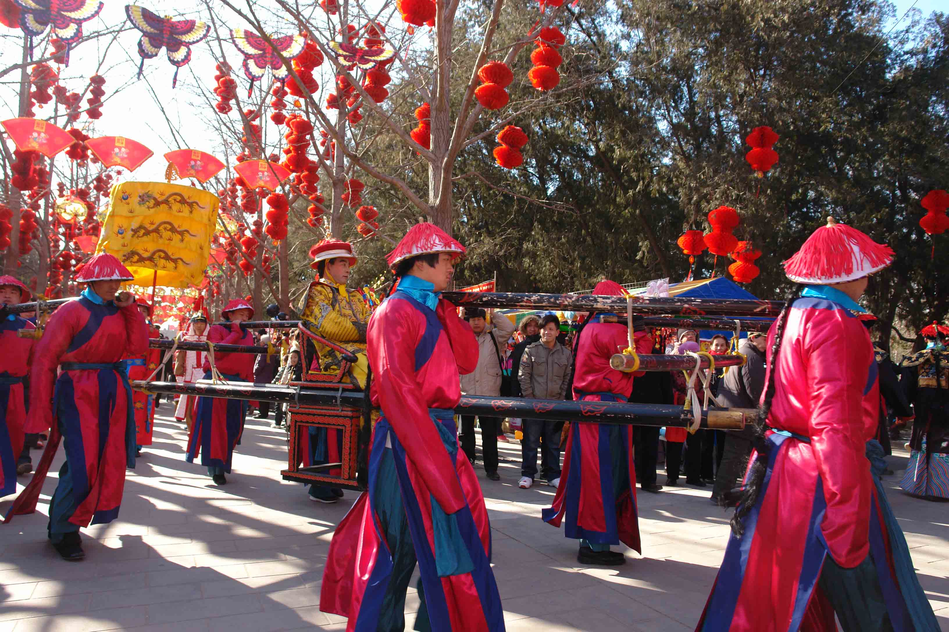 4、北京传统庙会的参与主体是广大市民,但因北京特殊的都城地位,庙会中多有都城市民文化与皇家文化的杂糅成分。如传统庙会中,妙峰山庙会期间,京城及天津各路会社因途经颐和园,慈禧等皇室人员在园中搭台观看园外表演,因表演而受封者,便称为“皇会”、“圣会”,身价地位陡增。新兴庙会中,地坛、圆明园等过去属于皇家禁地,庙会这类大众文化不可能进入其中,如今,地坛庙会大盛于京城,圆明园皇家庙会也于今年正式开张,在地坛庙会中甚至加入了皇帝巡游,与民同乐。