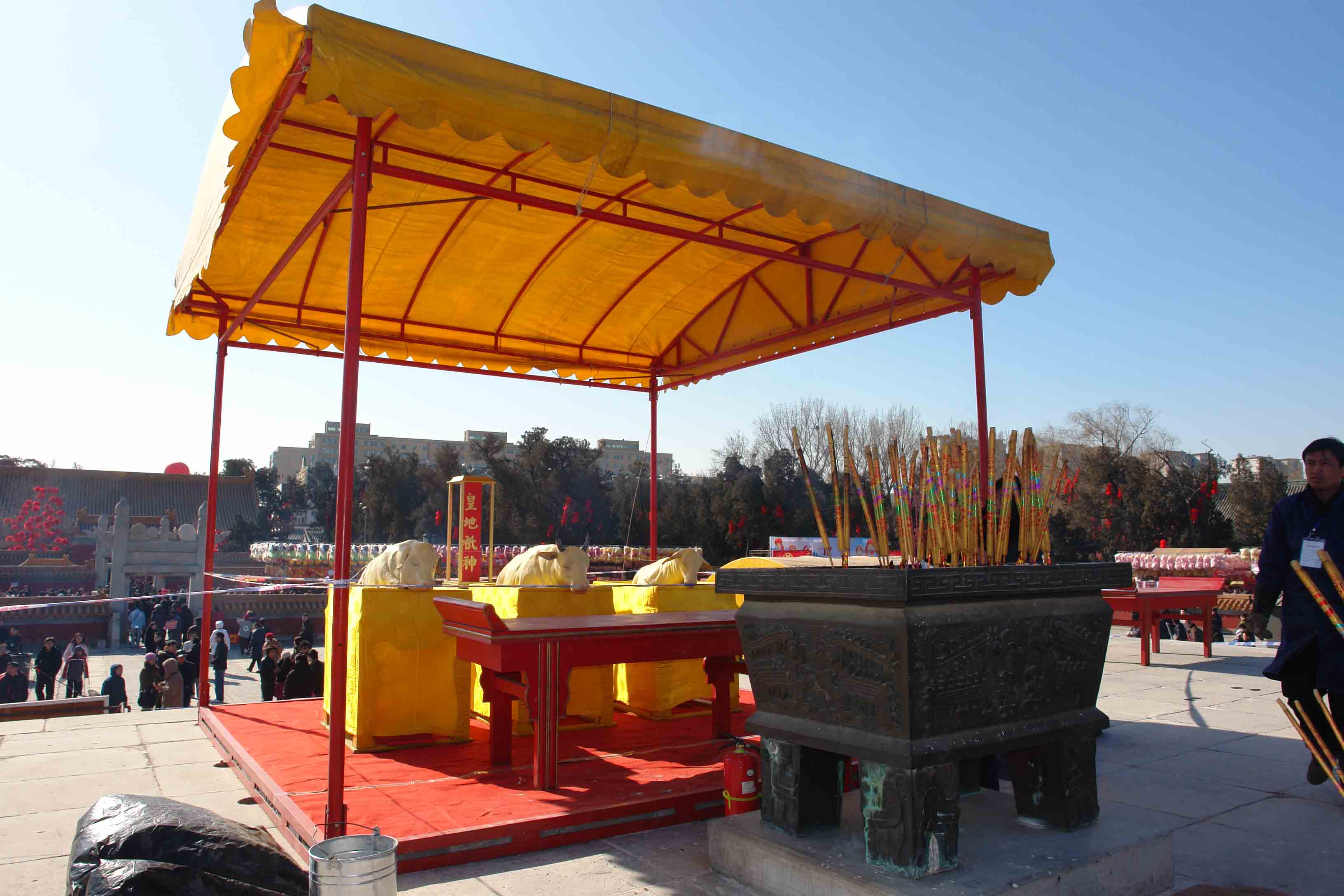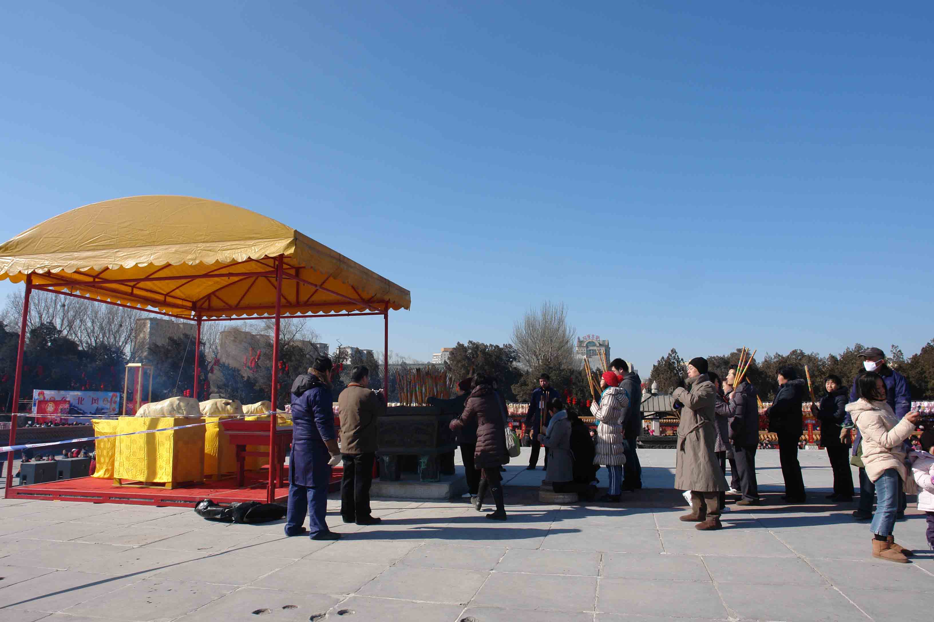 5、如今的庙会,信仰的成分说淡还浓,欲罢难舍。庙会中没有了供神的香火,首先会失去一部分信众,其次也白白流失了香火钱。在今年的地坛庙会中,管理人员在祭坛四周,围绳设限,只有购买香烛的游客才可以进入祭坛上香,虽然要单独再花一笔香火钱,但进内上香者依旧络绎不绝。在地坛向“地神”和岳镇海渎进香,过去是皇帝特权,如今平民百姓只要花钱就可以祭拜,信仰内涵、祭拜形式等转换都有耐人寻味之处。今年初二,我们一家人去地坛庙会,我特意陪老人购香进入祭坛,尽管她根本不知道拜的是什么神,但老人上香之虔诚、祈祷之周全,令人起敬。