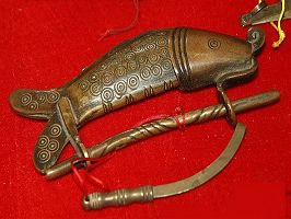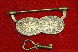 在传统中国,农民习惯性地在碗上凿字,在农具上具名,显然是怕被旁人偷走,但在通常情况下,毕竟是乡里乡亲,民风淳朴的地方,人们常常只是将大门虚掩,便安心地下田干活。不过,当商业日益发展,贫富悬殊渐渐出现,先前田园的宁静从而被打破。于是,人们便开始在锁具上大做文章,锁具的形式也愈趋复杂。远的不说,仅以晚近的明清时代为例。康熙《休宁县志》叙及徽州当地的物产时,对于铜锁有过这样的一段描述:“初制颇费工本,故精好,值重。其后售弥广,制弥杂……锁亦炼铜,俱苟且媒利,骎堕恶道,非故式矣。”这段话的意思是说:铜锁开始时用纯铜制作,当然极费工本,做得也很精致,价格更是不菲。但到后来,由于锁具之销售范围越来越广,锁具的制作便愈益庞杂,用料以炼铜代替,制作也不再那么认真——这是从制作的角度来状摹锁具的变化。其实,倘若我们换个角度,从锁具的消费情形来看,那么,早先用料好、制作精、价格高的铜锁,消费的对象可能仅限于一些较为富裕的人群,因为当时的社会治安及社会风气尚好,一般人还不需要通过锁具加强日常防范。但随着社会治安的变化,民情风俗之递嬗,普通民众也开始需要购买锁具自保身家,于是,锁具的消费群体大为扩大,从此,大批粗滥的锁具便如雨后春笋般地出现。当然,在鱼龙混杂的锁具市场上,还是有一些相对比较知名的品牌。对此,稍后乾隆时代的《徽城竹枝词》就这样描写: