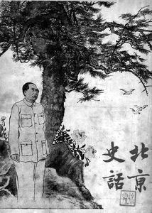 两本丛刊停刊之后,黄萍荪总结经验教训,努力抛弃旧思想,试图团结一班旧的文史工作者来为新社会做点贡献,在这样的背景下,《北京史话》面世了。这次是书的形式而不是杂志形式。《北京史话》1950年12月出版,印数寥寥,不足1000册。它的封面构思非同一般,是6位书画家集体创作的结晶:胡亚光画毛主席人像,周圭画毛主席衣褶,申石伽画松树,陈从周画磐石与和平鸽,唐云画芍药,沈尹默题写书名。黄萍荪这样解释这张封面:
