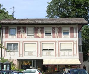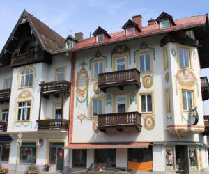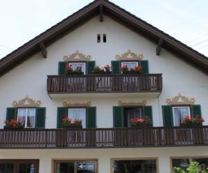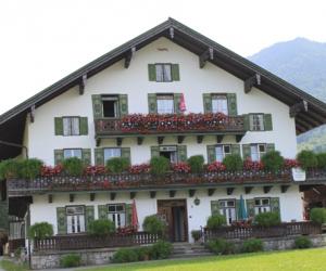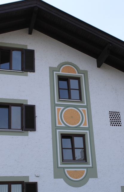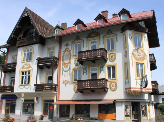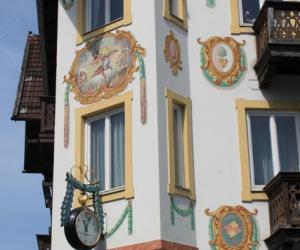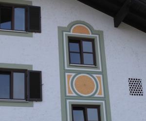 雕梁画栋,是中国传统建筑的典型特色。过去欧洲王公贵族的宫殿,在室内的屋顶和墙壁上也多绘有彩色图画。阿尔卑斯山北麓的巴伐利亚德国农庄,却喜欢把装饰性的图画描绘到外墙上。白色粉刷的墙壁,配上反映农村日常生活的各种彩色壁画,再加上深色的屋顶、泛黑的木质阳台、彩漆的木板外窗,和夏天盛开在窗前、阳台上的鲜花,以及周围的青山绿水,便构成了一幅理想的乡村田园风光。