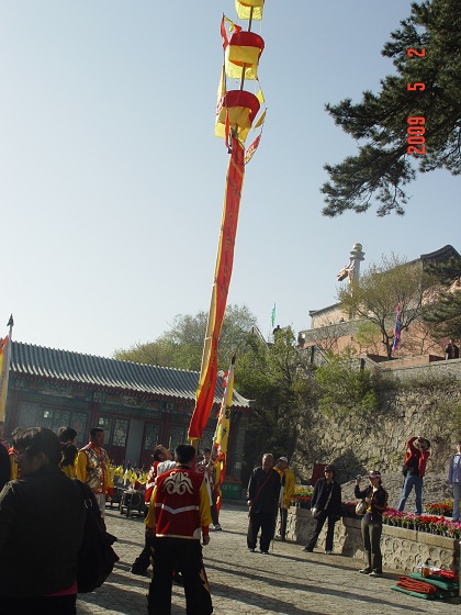 嗨,乐乐,如果你看了照片上那些花花绿绿簇新的服装道具后便以为在庙会上的武会都愿意展示最新的东西,那你可就大错特错了,事实是所有的武会都愿意告诉人们它拥有一段历史,衣服可以是新的,但会的历史却是越老越令人自豪,当你看到“万寿无疆高跷秧歌一堂”举着的两面破旧得堪称不堪的旗帜时,你这种感觉会更加明显。“万寿无疆高跷秧歌一堂”是5月2日到场的唯一一个皇会,据它自己的描述乃“北京市海淀区西北旺皇会嘉庆六年公元一八O二年始建高跷秧歌 光绪二十四年公元一八九八年授皇封”。那两面旗帜就是一个鲜明而独特的符号,无言地诉说着它所归属的香会与众不同的辉煌而悠久的历史。会首林先生说今年这旗帜已经111岁了。111岁的旗帜,诉说的不仅是“万寿无疆高跷秧歌一堂”的历史,也是妙峰山庙会的发展变迁史啊。