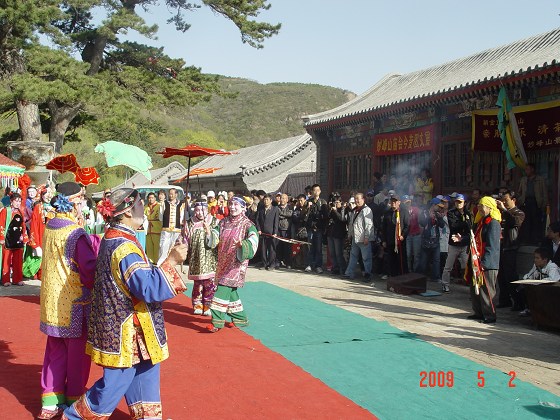 乐乐,记得我曾就告诉过你,关于妙峰山庙会我是有一些疑问的,比如:如果说碧霞元君的诞辰是四月十八(有些书上是这样写的),为什么明代的庙会在初一到十八,而到了清代便成了初一到十五竟未将诞辰日包括在内了呢?比如为什么四月初八会成为庙会中一个重要的日子?今天的人们对于碧霞元君的信仰又是如何呢?等等。带着这些问题我随机问了一些人,他们的回答颇出乎我的意料。我以为他们这天来进香是因为四月初八的重要性,但是他们的回答是因为五一放假,压根就不知道阳历5月2日对应的阴历日期;我以为他们对碧霞元君有浓厚的信仰,但除了“万寿无疆高跷秧歌一堂”一位表演者的妻子知道娘娘是碧霞元君外,要么从来没有想过娘娘是谁,要么在我的一再询问下说出令我愕然的答案:有三个人说娘娘就是王三奶奶,有两个人说这里所有的神都是娘娘,甚至有一个人说娘娘就是杨二郎的妹妹三圣母杨娥。还有两个人告诉我看看《封神榜》就知道了。那时我就想,对于他们来说,娘娘姓甚名谁其实并不重要,娘娘管什么能让自己的什么心愿实现才重要。就像药王,可以是扁鹊可以是华佗可以是孙思邈可以是李时珍,是谁都可以,只要他能帮人治病,帮助人们实现健康的良好愿望。