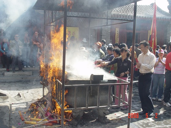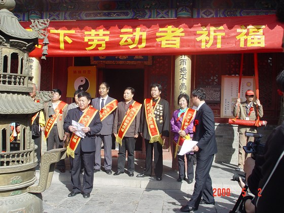 因为今年的四月初八与五一劳动节差不多相逢,这天妙峰山庙会上还有一项“为天下劳动者祈福”的特殊的仪式活动。披着绶带的数位劳动者代表不仅共同撞吉祥钟,而且在碧霞元君前燃香上香。我不知道当缭绕的香烟在他们胸前飘荡的时候,当他们对碧霞元君弯腰鞠躬的时候,他们都在想些什么,反正在我看来所有这些都那样意味深长。
