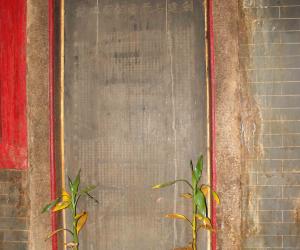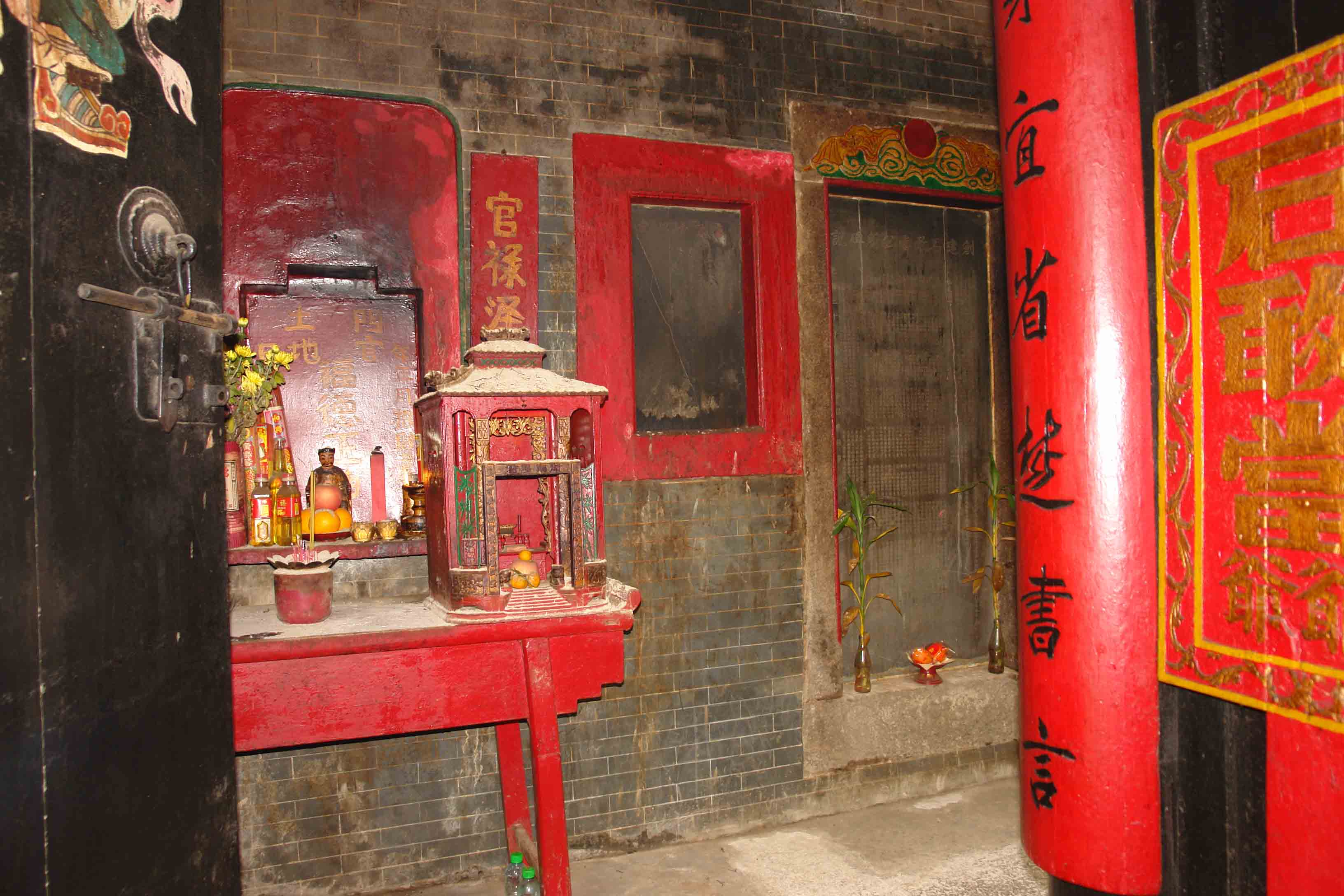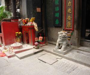 小庙被涂成红色,门楣上写有“威灵”二字,显然是赞颂所供奉的泰山石敢当。还刻有一副对联:“蚝镜沿今俗,圮桥振古风。”蚝镜:蚝,原字左边为“虫”字旁,右边为“毫”,查无此字,大概是民间的写法;蚝境,多写作“濠镜”,代指澳门。圮桥:石敢当行台位处渡船街与石街交界之处,现在的街道名牌标示为“桥巷”。圮桥,应指此处原有一座塌圮的桥。