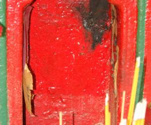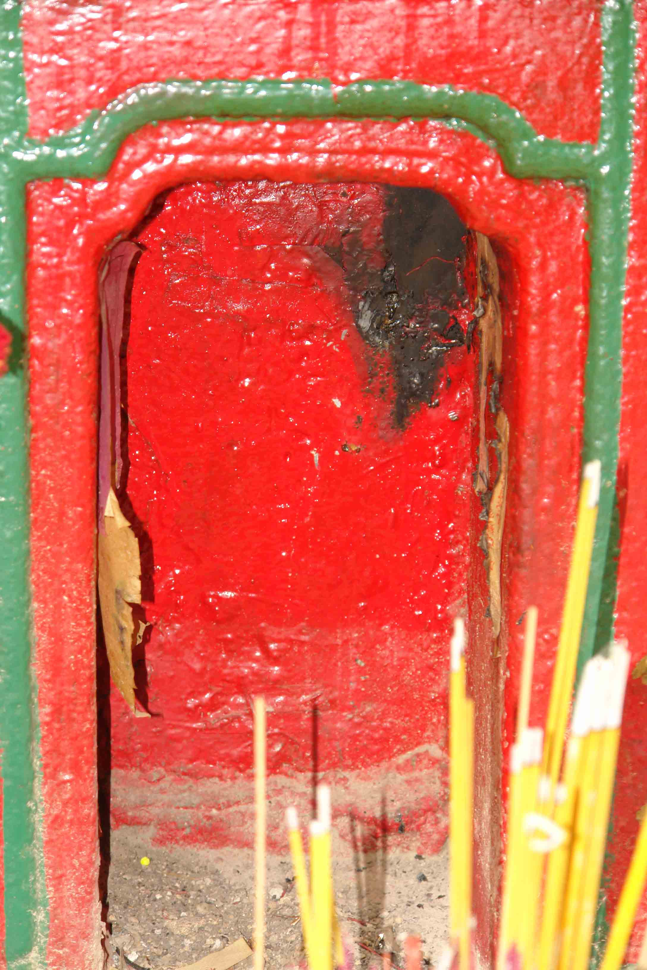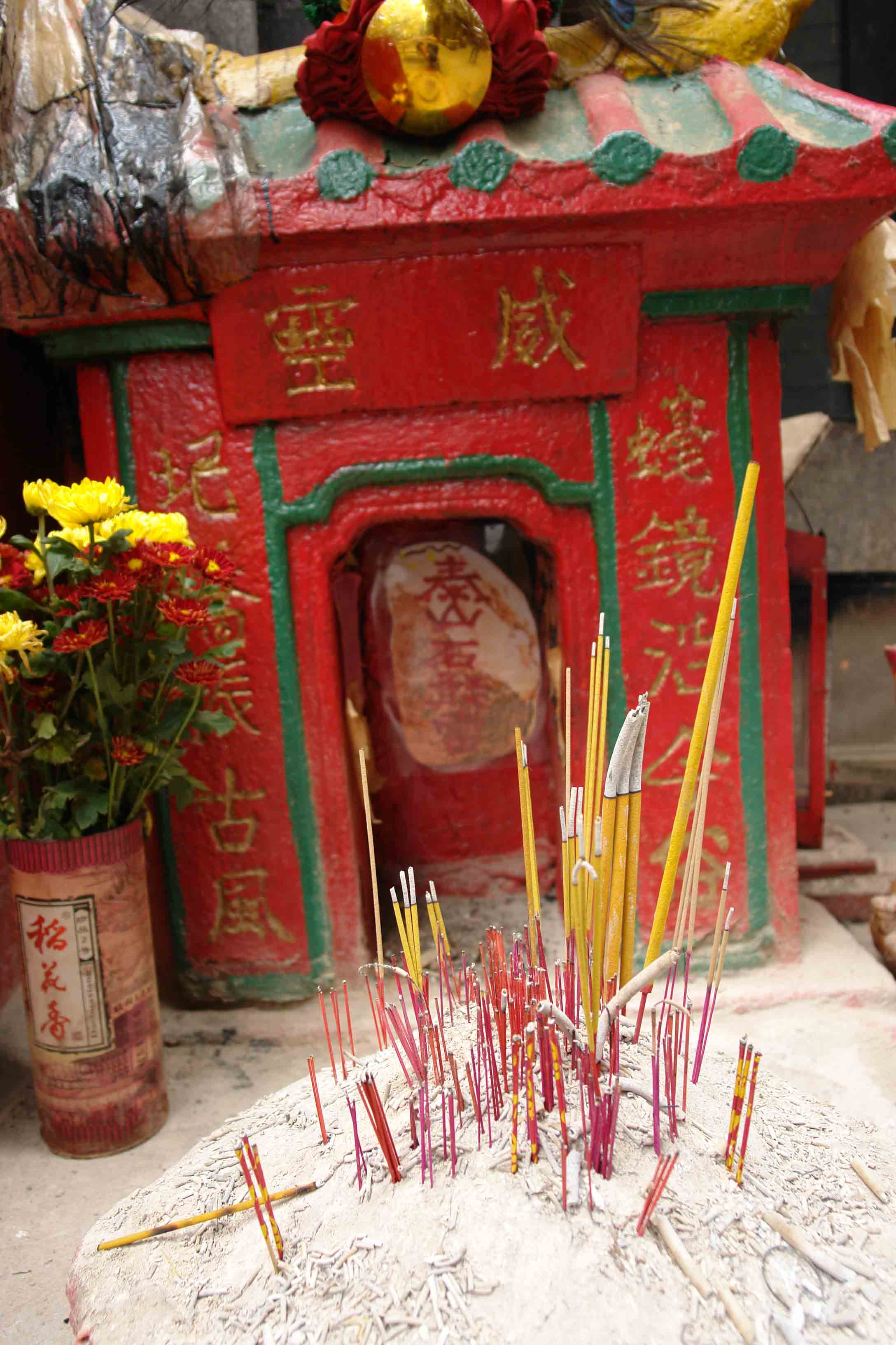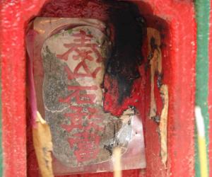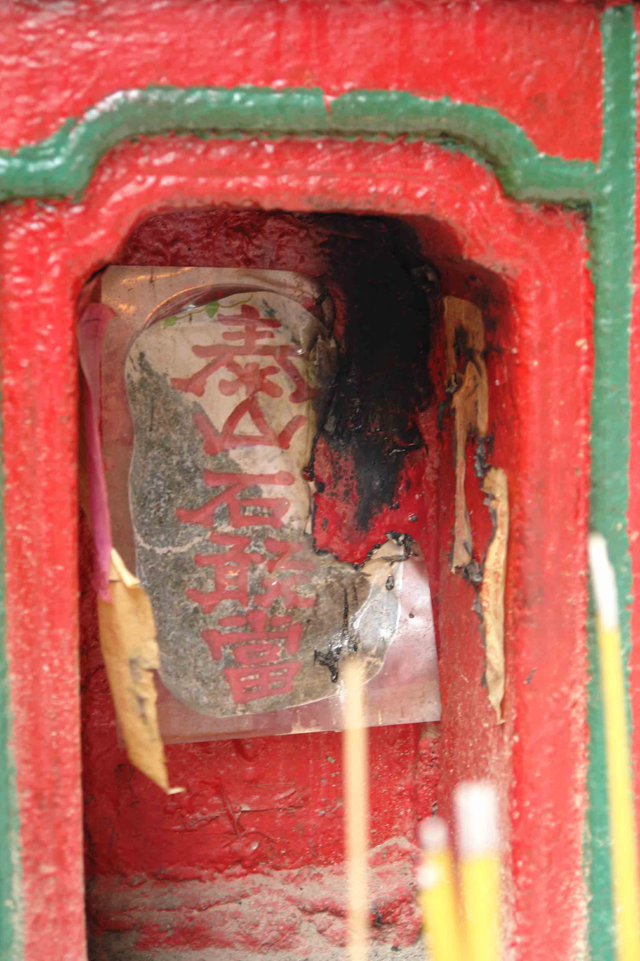 小庙神龛凹进去约有十多厘米,原有一尊香炉挡在前面,为方便我拍照,梁小姐把香炉和小庙门前都做了清理,露出了里面的石头。梁小姐讲,石头上面原来是有字的,时间长了字已经没有了,为了防止人们把它和旁边的社公混淆,她特意用一张纸写上“泰山石敢当”五个字,贴在石头上面。拿开香炉,露出里面贴有字纸的石块,人们进香时已经把原来写好的纸烧掉一块,梁小姐很不好意思,赶紧告诉我说,她已经重新写了新的,说着便进庙内把新写的拿了出来,很快就换上了。