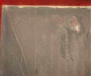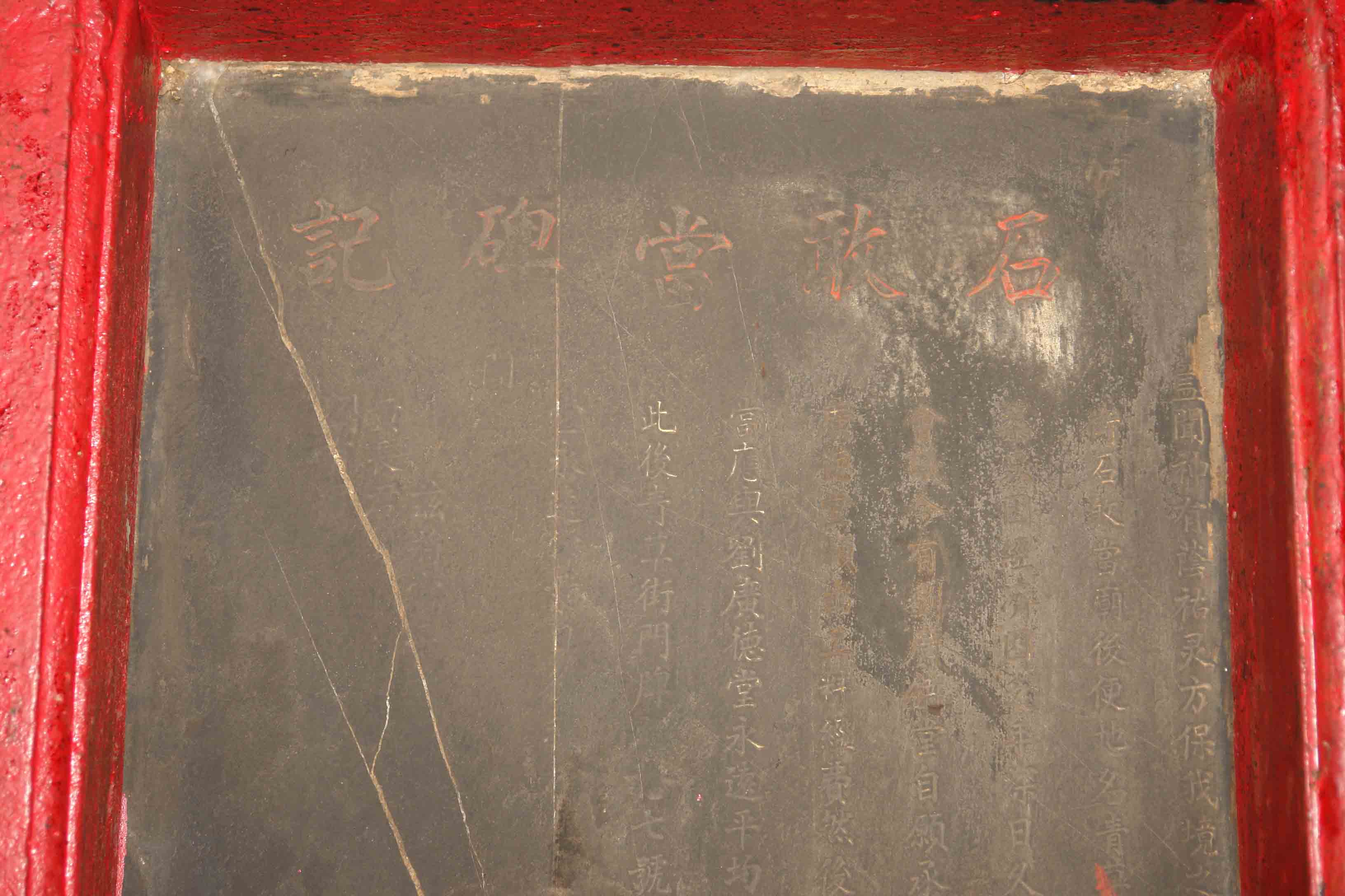 小碑被镶嵌在石框内,并用红漆予以涂绘,碑体完整,但碑面大多已经剥蚀,碑额“石敢当碑记”五字清晰可见,碑文中也还可以识别出部分字句。据梁小姐讲,两块碑相比,小碑的时间更早,是在建庙之前,和原来的泰山石敢当在一起的,前几年修庙的时候,建筑工人用带有腐蚀剂的水清晰碑面,结果把碑弄坏了。从尚可辨认的字迹来看,梁小姐说的情况并不准确,碑文中已经提到“石敢当庙”。结合可辨认的其他文字,此碑似乎是与修庙购地、捐款建庙等有关。最可惜的,还是落款处的时间根本无法辨认了。