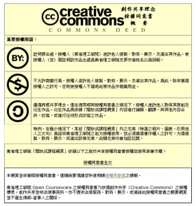 遵循同樣共享理念。僅在適用相同授權同意書之情況下,授權人准許他人散佈其原創及衍生作品。衍生作品為依據「開放式課程網頁」內容進行編輯、翻譯、與其他內容合併、改寫、或進行任何形式改變之作品。