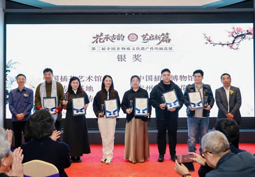 在全国非物质文化遗产传统插花研讨会上,全国非遗插花项目团队传承人共聚一堂,共话中国传统插花地域传承与创新经验交流。现场还为非遗传统插花保护与传承做出特殊贡献的秦雷、宋极、梁勤璋、谢晓荣授予特殊贡献奖;同时颁发最佳传统技法奖、最佳意境表达奖、最佳创新奖、最佳传承奖、最佳新锐奖、最佳地域特色奖。