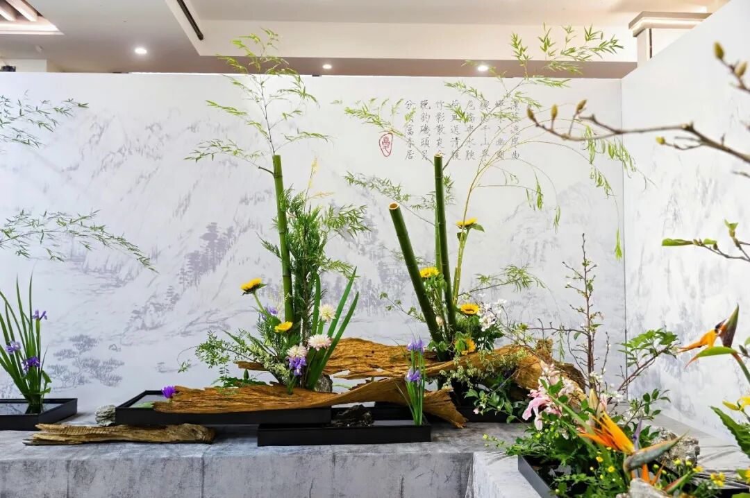 二楼由北京插花艺术研究会传统插花传承团队创作,“京韵、宋韵、写景式插花”三大主题展区以中华传统文化和水墨山水画《富春山居图》为引,借多种传统插花的表现形式,在花影横斜中,生动构建四季山水意境与生命力;触摸京都的人文肌理与时代新声、共赏穿越千年的宋韵风雅,融汇创新、气势恢宏,独具民族气韵与特质,让人耳目一新。
