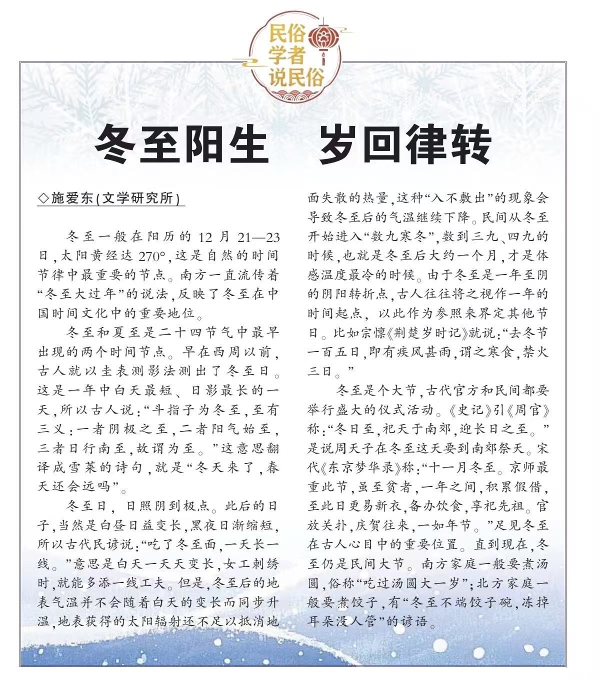 冬至是个大节,古代官方和民间都要举行盛大的仪式活动。《史记》引《周官》称:"冬日至,祀天于南郊,迎长日之至。"是说周天子在冬至这天要到南郊祭天。宋代《东京梦华录》称:"十一月冬至。京师最重此节,虽至贫者,一年之间,积累假借,至此日更易新衣,备办饮食,享祀先祖。官放关扑,庆贺往来,一如年节。"足见冬至在古人心目中的重要位置。直到现在,冬至仍是民间大节。南方家庭一般要煮汤圆,俗称"吃过汤圆大一岁";北方家庭一般要煮饺子,有"冬至不端饺子碗,冻掉耳朵没人管"的谚语。