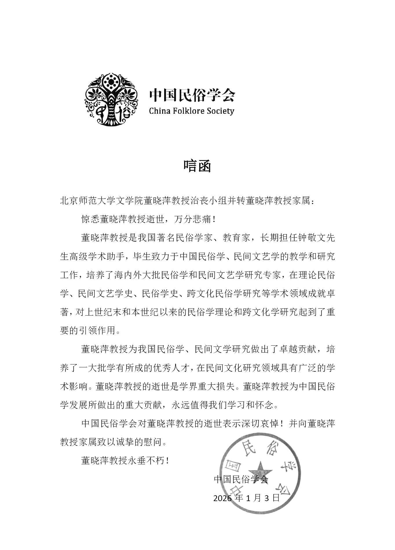 深切缅怀董晓萍教授——中国民俗学会唁函